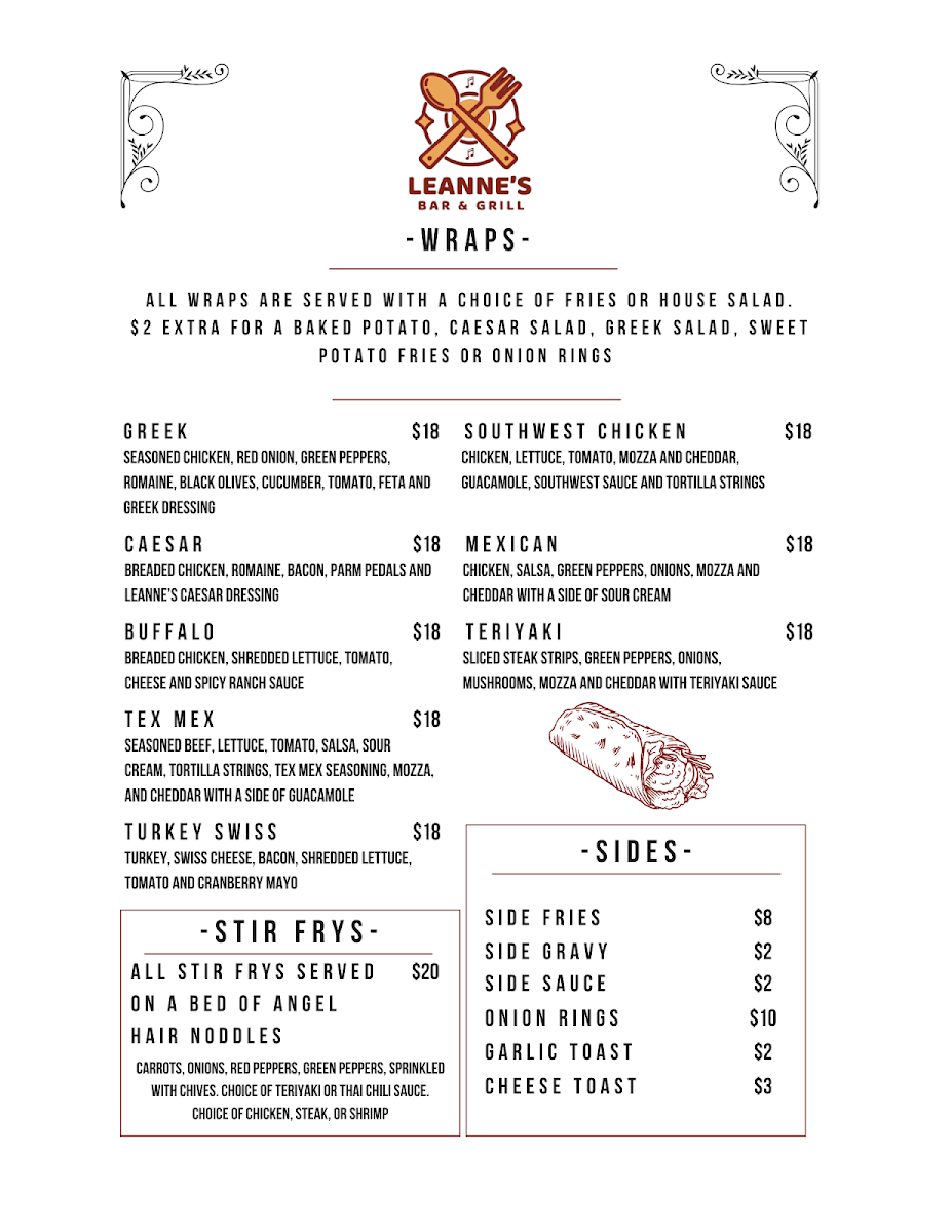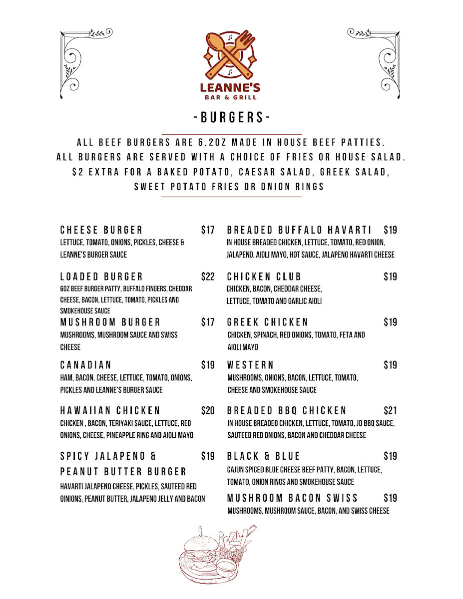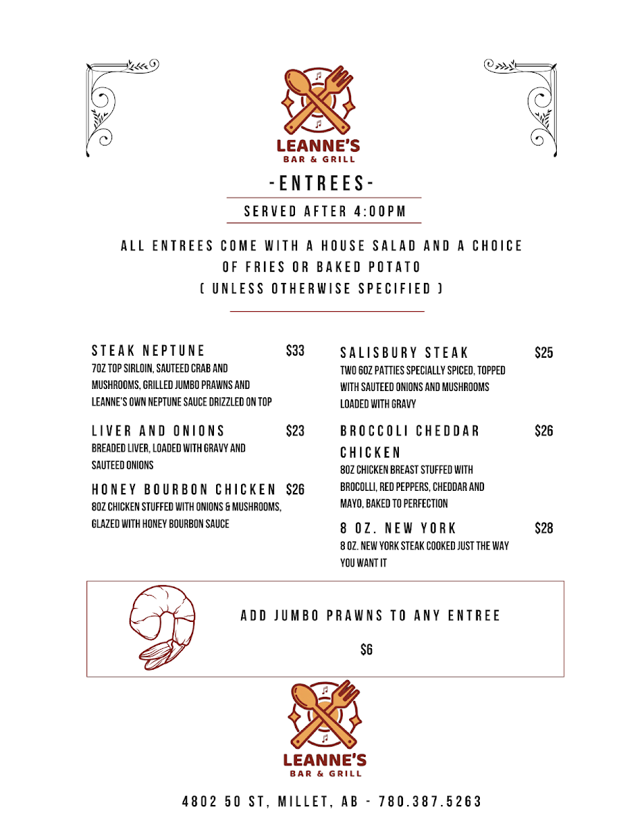 Located in the heart of Millet, Alberta, Leanne's Bar & Grill promises an unforgettable dining experience. Their menu boasts a delightful mix of crowd favorites, including mouthwatering burgers, flavorful pizzas, and enticing daily specials. Each dish is crafted with care, ensuring satisfying portions that please both the palate and the wallet.